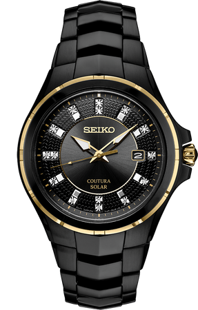 From the Coutura Collection.This handsome Men’s watch is designed with a black ion finished stainless steel case and bracelet with gold accents and a cabochon crown.The patterned sunray black dial features 15 diamond markers with a date calendar.The dial is protected with a scratch-resistant sapphire crystal.Powered by any light energy, its Solar Cell is energy-efficient with a 10-month power reserve once fully charged.No battery change is required.100M Water Resistant