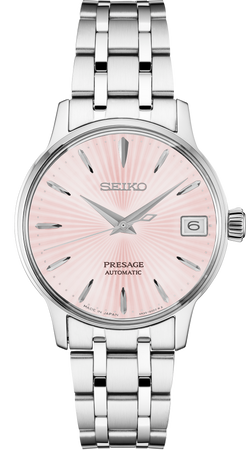 From the Presage Cocktail Time Collection. Offering the finest in Japanese mechanical watchmaking, the Presage Collection blends precision technology with superior craftsmanship and design. Inspired by the delights of a cocktail bar, this sophisticated watch features a pressed pattern, gloss finish and date calendar pink dial with pressed pattern, gloss finish and date calendar. The 23-jewel movement, with manual and automatic winding capability, beats at a frequency of 21,600 vibrations per hour, with a power reserve of approximately 41 hours. Crafted of stainless steel, this elegant timepiece includes a box-shaped crystal, screwdown see-through caseback, and double deployment clasp with push button release. 5 bar, 50M Water Resistant