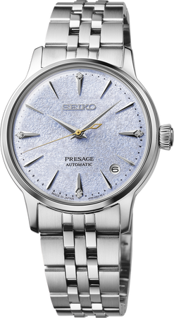 Seiko Presage Cocktail Time. Offering the finest in Japanese mechanical watchmaking, the Presage Collection blends precision technology with superior craftsmanship and design. Offering a graceful and fresh twist to the popular Cocktail Time series, this charming watch, inspired by the Frozen Skydiving cocktail, features a lovely light blue dial with a stunning pressed pattern evoking crunchy ice. Four diamonds, artfully incorporated into the signature wedge-shaped markers at 12, 3, 6, and 9 o’clock, add a luxurious sparkle. The streamlined case houses a 23-jewel automatic movement, which beats at a frequency of 21,600 vibrations per hour, with a power reserve of approximately 41 hours and manual winding capability. Crafted of stainless steel with a delicately tapered bracelet, this distinctive timepiece includes a date calendar, box-shaped crystal, screwdown caseback, and deployment clasp with push-button release. 5 bar, 50M Water Resistant