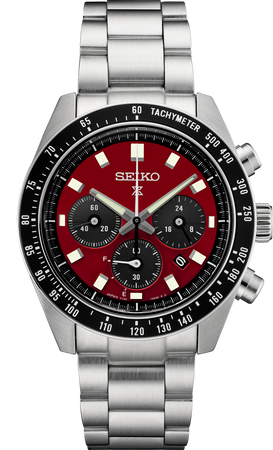 Prospex Speedtimer Solar Chronograph U.S. Special Edition. Designed for those who treat life as the ultimate adventure, the Seiko Prospex line meets every challenge with technological excellence and style. With vibrant colors inspired by vintage racing cars, this exciting Special Edition celebrates the 1969 “Speedtimer,” the world’s first self-winding chronograph. The chronograph function measures up to 60 minutes of elapsed time in 1/5-second increments and includes a split time function, while the solar cell, powered by any light source, with no battery change required, provides a 6-month power reserve when fully charged. Framed by a black tachymeter ring, the bold red dial features three black subdials, including 24-hour and power reserve indicators, a date calendar, and LumiBrite hands and markers. Crafted of stainless steel with tri-fold push button release clasp, and curved sapphire crystal with anti-reflective coating on the inner surface. 10 bar, 100M Water Resistant