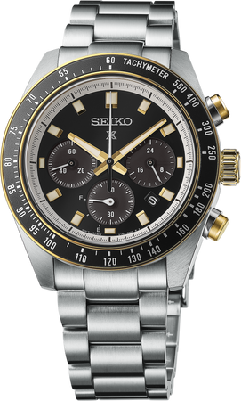 Prospex Speedtimer Solar Chronograph. Designed for those who treat life as the ultimate adventure, Seiko Prospex keeps moving forward, meeting every challenge with technological excellence and winning design. This rugged and stylish watch is a part of a high-intensity collection inspired by classic motorsports in the 1970s, when Seiko’s original 1969 “Speedtimer,” the world’s first self-winding chronograph, was at its prime. Reflecting the theme of a circuit race, the black and gold accents of the dial and tachymeter bezel evoke racing with extraordinary speed and excitement. The chronograph function measures up to 60 minutes of elapsed time in 1/5-second increments and includes a split time function, while the solar cell, powered by any light source with no battery change required, provides a 6-month power reserve when fully charged. The black dial with gold accents features three black subdials with a 24-hour indicator and power reserve indicator, as well as a date calendar, and LumiBrite hands and markers. Crafted of stainless steel, this sporty model includes a curved anti-reflective sapphire crystal, secure screwdown caseback and tri-fold push button release clasp. 10 bar, 100M Water Resistant
