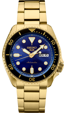 Seiko 5 Sports U.S. Special Creation. Adding new richness to classic sport/dress design, this stylish watch delivers all-day versatility with a cutting edge. Providing automatic technology that you control with every movement, this dynamic timepiece is powered by a 24-jewel movement that beats at a frequency of 21,600 vibrations per hour, with a power reserve of approximately 41 hours and manual winding capability. Framed by a gold uni-directional rotating elapsed timing bezel, the Blue dial features luminous hands and markers, and a date/day calendar. Crafted of stainless steel in gold finish, this exceptional watch includes a tri-fold push button release clasp with lock, as well as a screwdown see-through caseback for a view of classic timekeeping in action. 10 bar, 100M Water Resistant