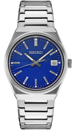 From the Essentials Collection. An updated classic, this sleekly angled watch features a vibrant blue pressed-pattern dial with simple stick indices, date calendar, and LumiBrite hands and markers. Crafted of stainless steel with a scratch-resistant sapphire crystal, this versatile timepiece includes a secure screwdown caseback and tri-fold push button release clasp. 10 bar, 100M Water Resistant
