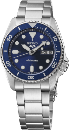 Seiko 5 Sports SKX Mid-Size. With vintage styling and colors recalling the quartz diver’s watches of the 1980s, the mid-size SKX design offers the 38mm case diameter of the originals, but with a slimmer case and a durable, yet comfortable, three-row sport bracelet. Providing automatic technology that you control with every movement, this dynamic timepiece is powered by a 24-jewel movement that beats at a frequency of 21,600 vibrations per hour, with a power reserve of approximately 41 hours and manual winding capability. The navy blue dial, framed by a coordinating uni-directional rotating elapsed timing bezel, features a day/date calendar and luminous hands and markers. In stainless steel, with locking tri-fold push button release clasp and a screwdown see-through caseback for a view of classic timekeeping in action. 10 bar, 100M Water Resistant