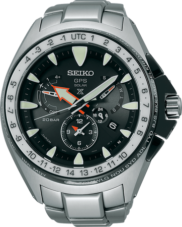 Prospex GPS Solar. Crafted for high-intensity sports in light and durable titanium, this timepiece is GPS controlled for automatic time and time zone adjustment with an exceptional degree of accuracy. This unique watch includes a daylight saving time function, perpetual day and date calendar correct to the year 2100, date window, and 24-hour indicator. To ensure smooth operation, it is equipped with a signal reception result indicator and is powered by light energy, with no battery change required. Topped by a dual-curved crystal with super-clear coating, the black dial with orange accents includes LumiBrite hands and markers for superior visibility. With a secure screwdown caseback and tri-fold push button release clasp. 20 bar, 200M Water Resistant