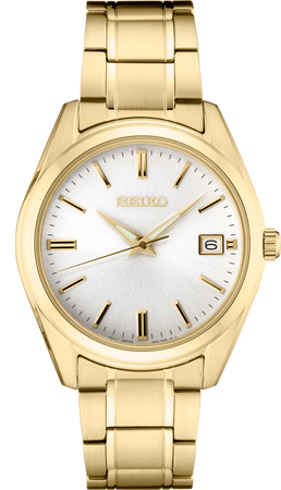 From the Essentials Collection. With classic dress/sport styling, this perfectly tailored design combines sophisticated minimalism with versatility. The clean white dial features a date calendar and LumiBrite hands. In stainless steel with gold finish, and sapphire crystal for superior scratch resistance. 10 bar, 100M Water Resistant